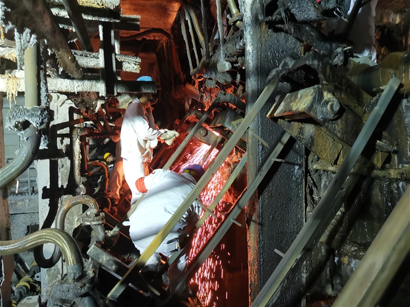剛剛停機(jī)的現(xiàn)場(chǎng),被熱浪團(tuán)團(tuán)包裹,像極了一個(gè)巨型蒸籠。檢修時(shí)間只有兩小時(shí),這對(duì)他們來(lái)說(shuō),無(wú)疑是一個(gè)挑戰(zhàn),大家等不及設(shè)備溫度降下來(lái),就迫不及待地來(lái)到各自負(fù)責(zé)區(qū)域,一瞬間,澆鋼區(qū)、二冷室、拉矯機(jī)、輥道旁……人頭攢動(dòng)、熱鬧非凡。二冷室內(nèi)潮濕悶熱,作業(yè)環(huán)境復(fù)雜,讓人呼吸都變得困難,幾名身穿白色阻燃服的中包工,順著噴淋管爬上爬下,他們腳踩在細(xì)細(xì)的支架上。這群“蜘蛛俠”在縱橫交錯(cuò)的管道間,隨意調(diào)整著身體,有的仔細(xì)清理噴咀,有的認(rèn)真切割冷鋼,這看起來(lái)困難重重的工作,他們卻游刃有余。不一會(huì),他們厚厚的工作服被汗水浸濕,臉上的汗水也在大負(fù)荷照明燈下泛著亮光??杀M管如此,他們的目光始終盯在設(shè)備上,沒(méi)有半分懈怠。