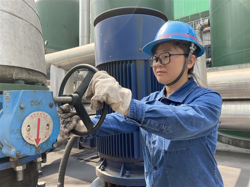 圖二:驕陽(yáng)如火般綻放,水泵工王兵開啟棒二濁環(huán)增壓泵進(jìn)口閥門,她白皙的臉龐被曬得通紅,即便如此,她仍然以女工特有的耐心與堅(jiān)韌,守護(hù)著水系統(tǒng)的平穩(wěn)順行。