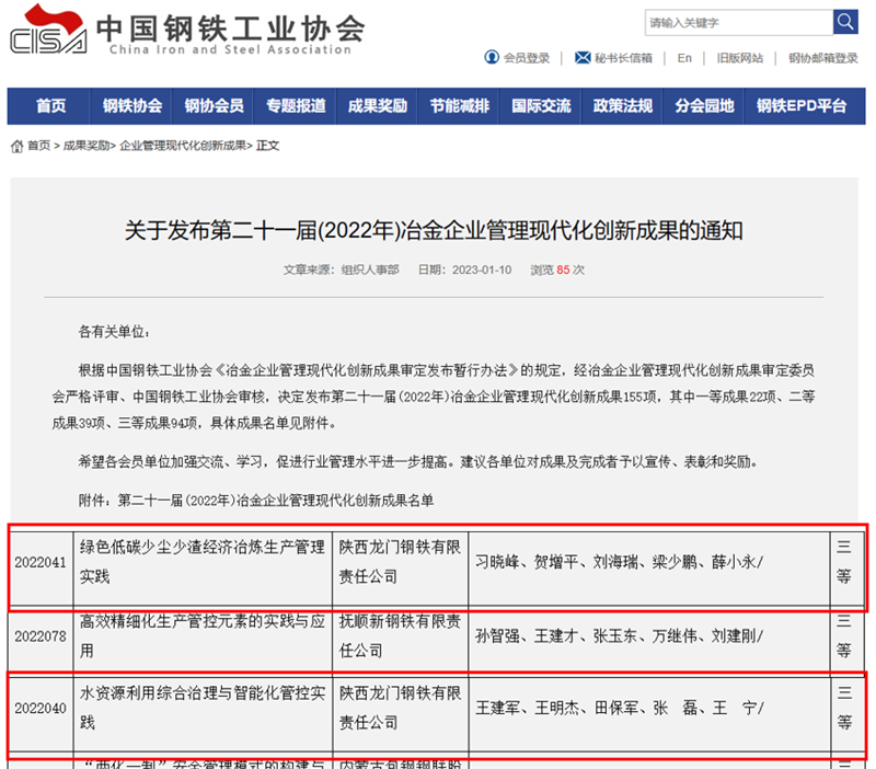近日,從中國(guó)鋼鐵工業(yè)協(xié)會(huì)傳來喜訊,在第二十一屆(2022年)冶金企業(yè)管理現(xiàn)代化創(chuàng)新成果評(píng)選中,公司《綠色低碳少塵少渣經(jīng)濟(jì)冶煉生產(chǎn)管理實(shí)踐》《水資源利用綜合治理與智能化管控實(shí)踐》兩個(gè)項(xiàng)目榮獲冶金企業(yè)管理現(xiàn)代化創(chuàng)新成果三等獎(jiǎng)。