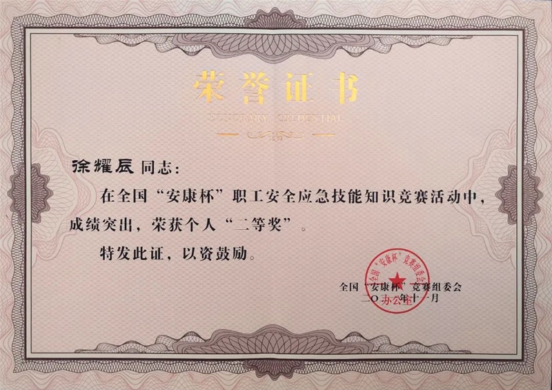 近日,公司喜獲全國“安康杯”職工安全應(yīng)急技能知識競賽活動“優(yōu)秀組織單位”榮譽稱號。公司職工徐耀辰榮獲二等獎。