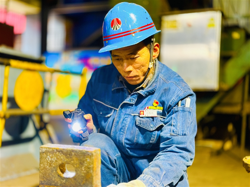 在火熱的連鑄生產(chǎn)現(xiàn)場,班長陳超所在的維修班嚴格執(zhí)行高溫天氣點巡檢制度,確保設(shè)備維護到位,聯(lián)鎖保護到位。悶熱炙烤的廠房里已是一片火熱,他們穿梭于臺上臺下,身上的藍色工服早已浸滿汗水。